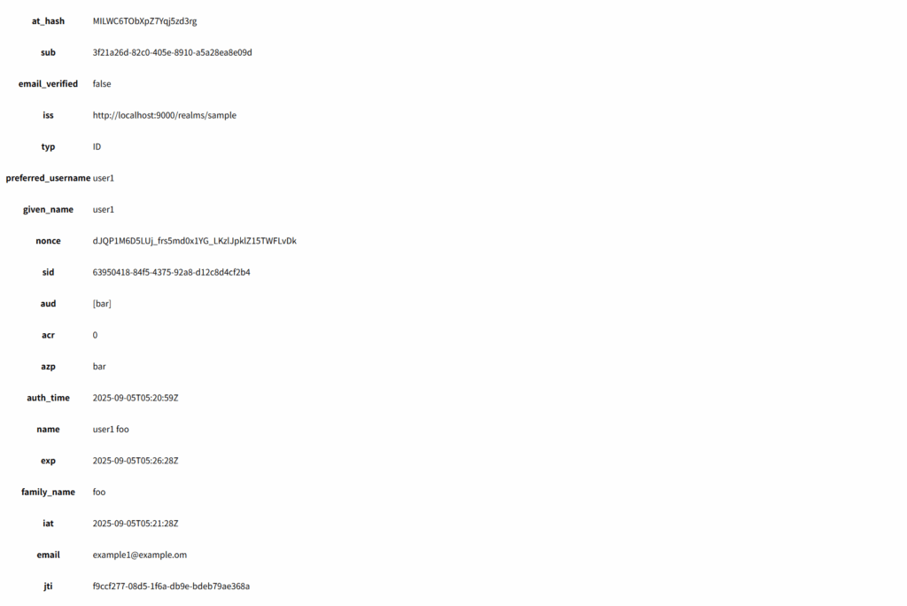 ID及びパスワードによる認証の後、IDトークンが持つクレームを確認できます。Keycloak のログイン画面からログインして確認してみましょう。